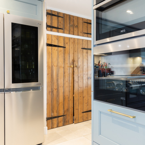 With this layout we were able to position the range cooker centrally on the long wall with the fridge freezer on the end, this allowed for the sink to be situated on the return wall overlooking the garden. We also had a narrow passage through to the utility and it made sense to utilise this for tall storage as well as an overflow for a combi oven and a very important wine fridge!